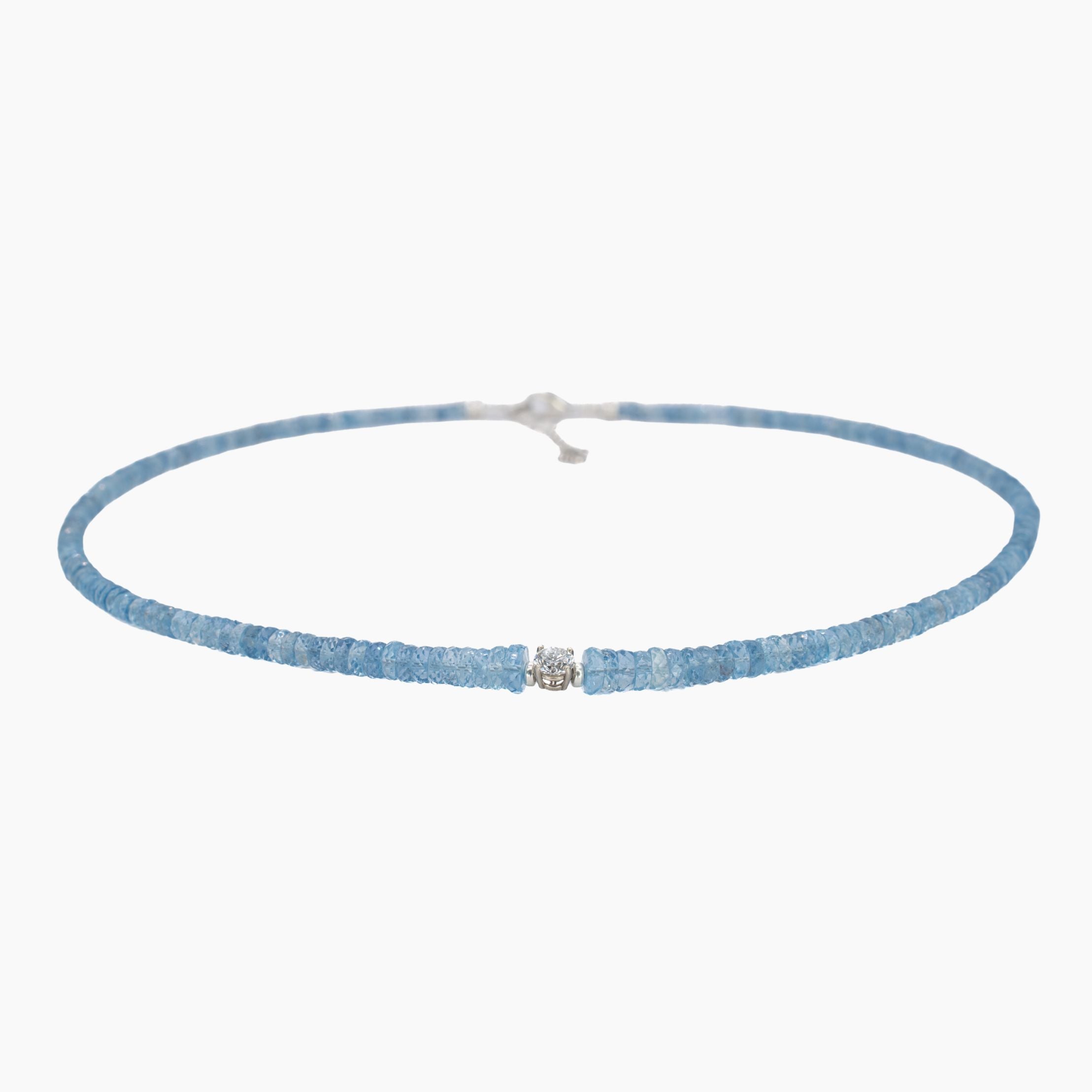 Materials & Design: Aquamarine stones (70 ct), a 0.5 ct lab-grown diamond, white gold beads and clasp, and a nylon-coated metal wire. Water-resistant, friction-resistant, pull-resistant, and gives a calm, powerful presence.